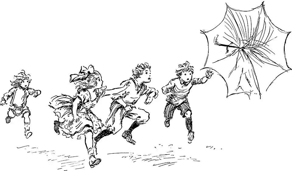 We all ran after it like mad,Tom and me, and Jack and Ella,When the old thing stopped, and, crash!Every one of us went smashRight on top of that umbrella! |