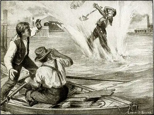 But when we reached the top of the shaft, you can imagine our amazement at seeing the man who had supposedly perished, sitting calmly in the center of an admiring group of reporters, and telling a most astonishing story—such a story as was almost beyond belief! When the tunnel discharged like a great air-gun, he had played the part of a bullet, and had been shot clear through the bed of the river and up to the surface! Two men were in a rowboat under a dock picking up driftwood, when suddenly a screaming, mud-covered object shot up out of the depths, rising clear of the water, and dropping back again with a splash. They were terror-stricken; panic seized them, particularly when the object reappeared and struck out after them, but Jerry’s cries for help brought them to their senses, although it643