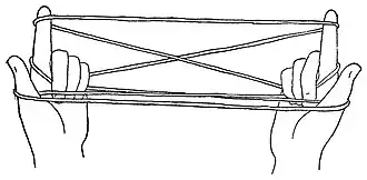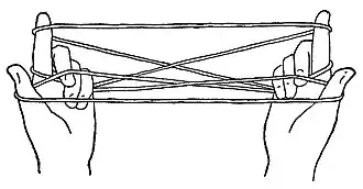 Third: Pass the middle, ring and little fingers of each hand toward you over both strings of the lower index loop, and pull them down by closing these fingers on the palm (Fig. 220).