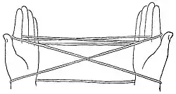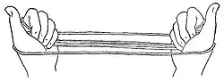 Fourth: Incline the hands slightly toward each other, and keeping the strings tight, turn the palms away from you, and pass each thumb under both the near and