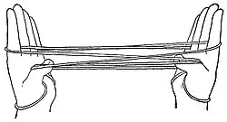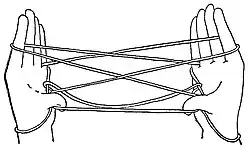 You now have on each hand: a loop on the thumb, a loop on the index, a loop on the little finger and a loop on the wrist. Under the wrist loop passes a string formed of the near thumb string and the far little finger string.