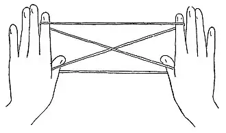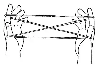 you and point upward. You now have a long crossed loop on each index, a long crossed loop on each thumb and a single cross in the centre of the figure (Fig. 482).