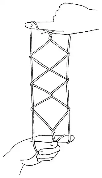 This game is really only a continuation of the "Turtle," but I have made it a separate figure, provisionally, because I saw the Philippine Linao Moros at the St. Louis Exposition form it from another figure which I could not record, but I think it was the same as "Bagobo Diamonds." Subsequently I learned the figure, as a part of the "Turtle," from Dr. Furness, who collected it in the Caroline Islands from the Uap girl "Dakofel."