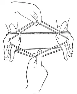 "A" inserts his left index from above into the left thumb loop, near the centre of the figure, and his left thumb from above into the right thumb loop and then,