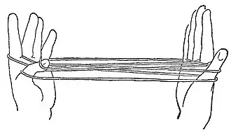 Third: Bend each middle finger down toward you over the index strings, and take up from below, on the back of the finger, the far thumb string (Fig. 98 , Left hand) and return the middle finger to its original position (Fig. 98 , Right hand). Release the loops from the thumbs (Fig. 99). You now have a loop on each index, a loop on each middle finger, and a loop on each little finger.