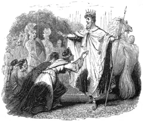 'Then did the Queen, the Lady Emily, and their train, in their womanly hearts, begin to weep. * * * And when they looked upon their gaping wounds, they implored his mercy upon their knees, till his mood began to soften.'