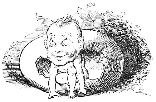 So when all five had sat on it eight days, the fifth heard plainly that there was a gosling in the egg, which screeched out, "Herrings and brose, porridge and milk." So she picked a hole in it, but instead of a gosling out came a man child, and awfully ugly it was, with a big head and little body. And the