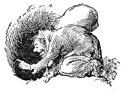 All this the old lass screeched out as she bent over towards the bear. But just then her bag fell over her ears, and dragged her down, and slap! down went the old crone head over heels into the pitfall.