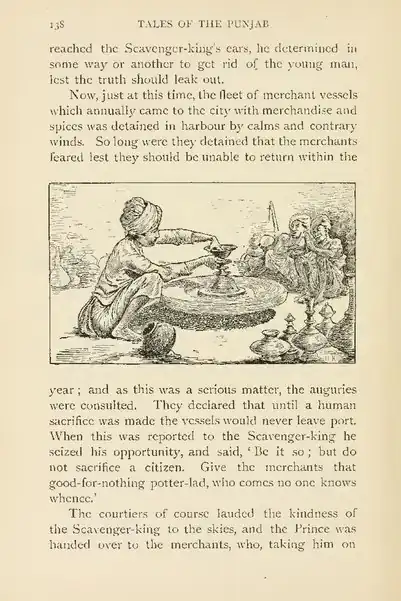 year; and as this was a serious matter, the auguries were consulted.They declared that until a human sacrifice was made the vessels would never leave port.When this was reported to the Scavenger-king he seized his opportunity, and said, 'Be it so; but do not sacrifice a citizen.Give the merchants that good-for-nothing potter-lad, who comes no one knows whence.'