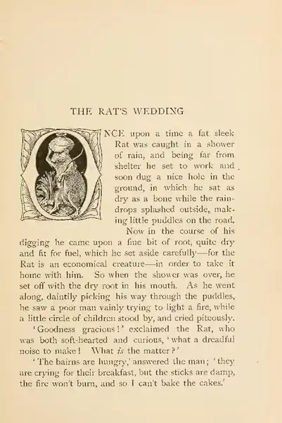 NCE upon a time a fat sleek Rat was caught in a shower of rain, and being far from shelter he set to work and soon dug a nice hole in the ground, in which he sat as dry as a bone while the raindrops splashed outside, making little puddles on the road. Now in the course of his digging he came upon a fine bit of root, quite dry and fit for fuel, which he set aside carefullyfor the Rat is an economical creaturein order to take it home with him. So when the slower was over, he set off with him. As he went along, daintily picking his way through the puddles, he saw a poor man vainly trying to light a fire, while a little circle of children stood by, and cried piteously.