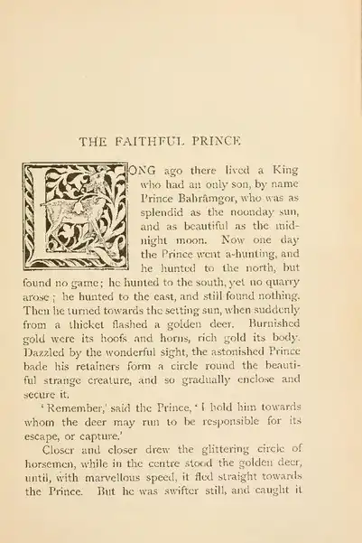 ONG ago there lived a King who had an only son, by name Prince Bahrâmgor, who was as splendid as the noonday sun, and as beautiful as the midnight moon. Now one day the Prince went a-hunting, and he hunted to the north, but found no game; he hunted to the east, and still found nothing. Then he turned towards the setting sun, when suddenly from a thicket flashed a golden deer. Burnished gold were its hoofs and horns, rich gold its body. Dazzled by the wonderful sight, the astonished Prince bade his retainers form a circle round the beautiful strange creature, and so gradually enclose and secure it.
