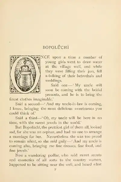 But Bopoluchi, the prettiest girl of them all, looked sad, for she was an orphan, and had no one to arrange a marriage for her. Nerertheless she was too proud to remain silent, so she said gaily'And my uncle is coming also, bringing me fine dresses, fine food. and fine jewels.'