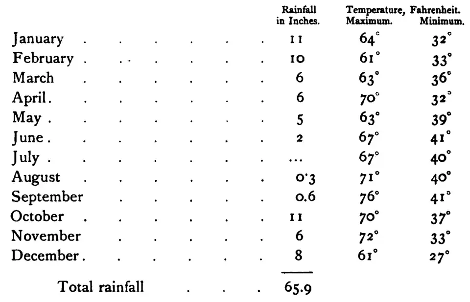 The prevailing formation in the redwood belt is sandstone; and the tree attains its maximum either on deep sandy loam or on gravel full of moisture. The climate is remarkably even and moderate, with warm days, cool nights, and scarcely any frost even in winter; while the air is charged with humidity, and the annual rainfall amounts to from 60 to 80 inches. The following observations, taken in 1900 at Crescent City, show the nature of the climate in which the redwood thrives:—