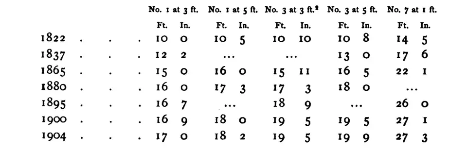 In Hertfordshire there are many fine cedars, of which the most notable are growing on a lawn at Bayfordbury.[2] Mr. Clinton Baker tells me that they were raised from seeds of the Enfield Cedar, and planted in 1765. They have been measured at various intervals by his grandfather, father, and himself, as follows:—