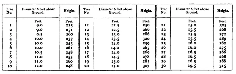 - ↑ A "Report on the Stanislaus and Lake Tahoe Forest Reserves, by G.B. Sudworth," Bulletin No. 28; U.S. Dept. of Agriculture, Division of Forestry, published at Washington in 1900, which gives the following table of measurements of thirty of the big trees in the Calaveras Grove:—