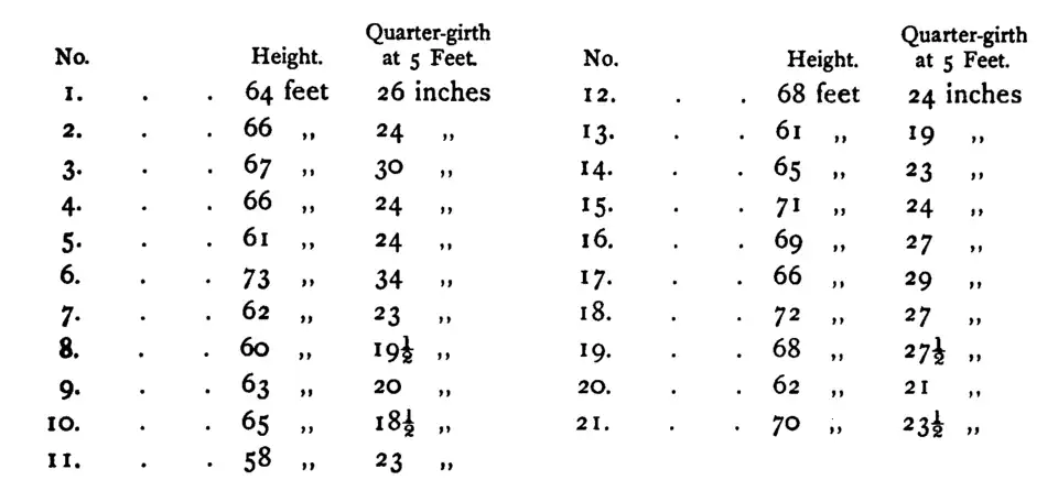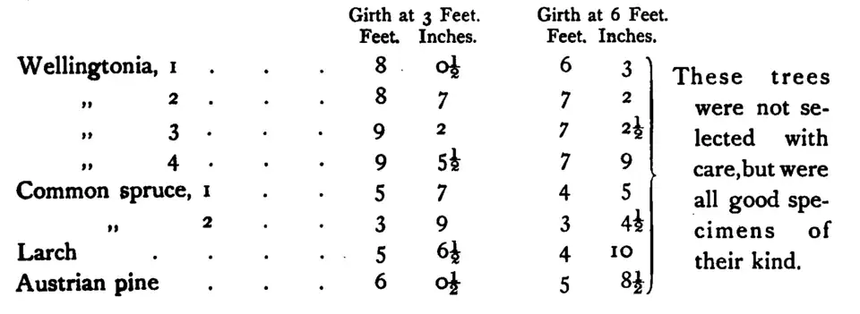 A tree planted in the pleasure ground at Cloverley by the late Mr. W.E. Gladstone in 1872, now measures 56 by 8½ feet; another planted Jan. 1, 1864, is now 65 by 11 feet.