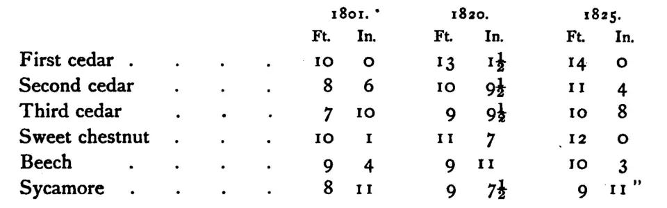 stated that it was 5 feet and 1 inch in circumference, but omitted to mention at what height from the ground this measurement was taken. In 1801 the dimensions of these trees, as well as of other kinds planted at the same period, were taken; the observations were repeated in 1820, and I am now enabled to add the present size of those which had been before noticed, as well as some others of different kinds but of the same age, which were not before attended to. The circumference of the trunks is taken in all cases at three feet above the ground, and it will be seen by