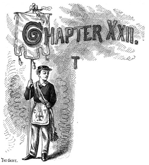 OM joined the new order of Cadets of Temperance, being attracted by the showy character of their "regalia." He promised to abstain from smoking, chewing and profanity as long as he remained a member. Now he found out a new thing—namely, that to promise not to do a thing is the surest way in the world to make a body want to go and do that very thing. Tom soon found himself tormented with a desire to drink and swear; the desire grew to be so intense that nothing but the hope of a chance to display himself in his red sash kept him from withdrawing from the order. Fourth of July was coming; but he soon gave that up—gave it up before he had worn his shackles over forty-eight hours—and fixed his hopes upon old Judge Frazer, justice of the peace, who was apparently