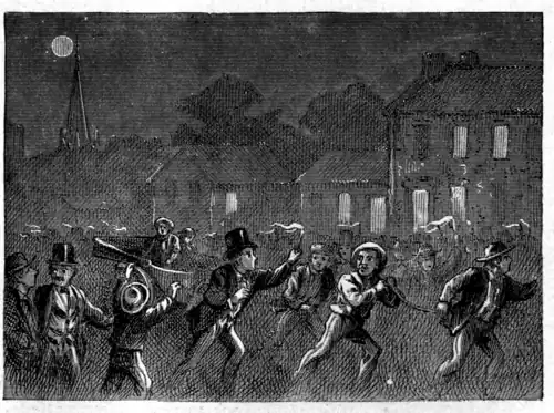 Away in the middle of the night a wild peal burst from the village bells, and in a moment the streets were swarming with frantic half-clad people, who shouted, "Turn out! turn out! they're found! they're found!" Tin pans and horns were added to the din, the population massed itself and moved toward the river, met the children coming in an open carriage drawn by shouting citizens, thronged