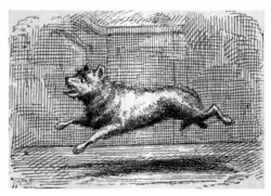 But he grew tired once more, after a while; tried to amuse himself with a fly but found no relief; followed an ant around, with his nose close to the floor, and quickly wearied of that; yawned, sighed, forgot the beetle entirely, and sat down on it! Then there was a wild yelp of agony and the poodle went sailing up the aisle; the yelps continued, and so did the dog; he crossed the house in front of the altar; he flew down the other aisle; he crossed before the doors; he clamored up the home-stretch; his anguish grew with his progress, till
