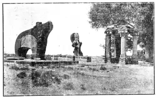Image of the Boar Incarnation of Vishnu, dedicated in the 1st year of the reign of the Huna King Toramana, by Dhanyavishnu with the ruins of a temple of Vishnu, at Eran, Sagar District, C. P.