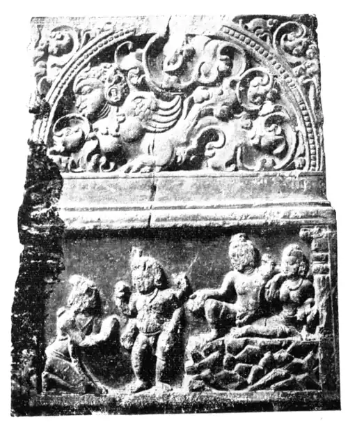 Arjuna receiving the boon from Siva and later seeing Siva and Durga on Kailasa, bas-relief on pillar from Rajaona, Munger District, Bihar, (Indian Museum, Calcutta.)