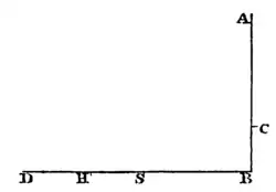 our object was to add the remainder of the root of two hundred, after the subtraction of ten, that is to say, the line C B, to the line H D, or to twenty, minus the root of two hundred, we cut off from the line B H a piece equal to C B, namely, the line S H. We know already that the line A B, or the root of two hundred, is equal to the line B H, and that the line A C, which represents the ten, is equal to the line S B, as also that the remainder of the line A B, namely, the line C B is equal to the remainder of the line B H, namely, to S H. Let us add, therefore, this piece S H, to the line H D. We have already seen that from the line B D, or twenty, a piece equal to A C, which is ten, was cut off, namely, the piece B S. There remains after this the line S D, which, consequently, is equal to ten. This it was that we intended to elucidate. Here follows the figure.