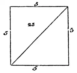 angles, may be found by multiplying the length by the breadth. The product is the area. For instance: a quadrangular piece of ground, every side of which has five yards, has an area of five-and-twenty square yards. Here is its figure.