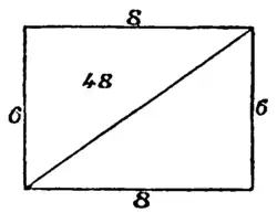 Second kind.—A quadrangular piece of ground, the two long sides of which are of eight yards each, while the breadth is six. You find the area by multiplying six by eight, which yields forty-eight yards. Here is (56) the figure to it:
