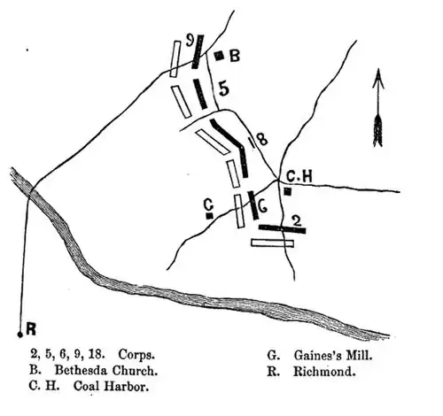 Instead of walking over the obstacle, Grant decided to go round it. Stealing a march upon Lee, he moved suddenly southeast, and crossed the Pamunky at Hanover Town, opened a new base of supplies at White House, forcing Lee to fall back on the Chickahominy.
