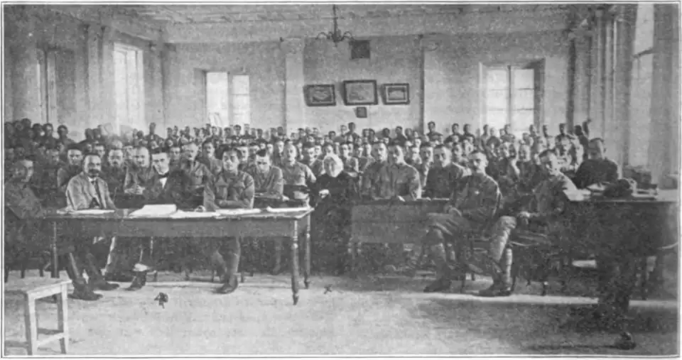| Cheliabinsk Convention of the Czechoslovak Army, at which decision was taken to march to Vladivostok regardless of opposition. Corporal (now Lieut.) Karel Zmrhal, now in this country, sits at table on the left as chairman of convention. The woman in the center is Katherine Breshkovskaya, grandmother of the Russian Revolution. | ||