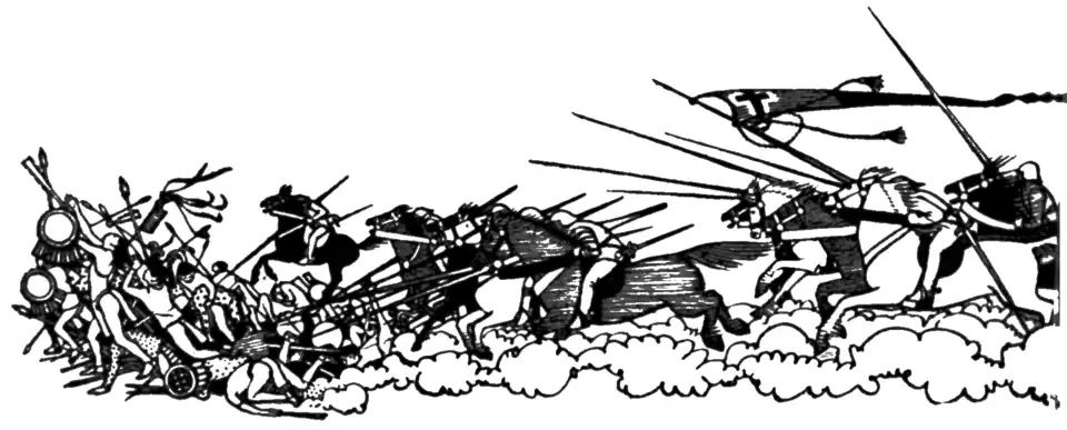 The approach of Cortés had been greatly retarded by the broken nature of the ground. When he came up, the Indians were so hotly engaged, that he was upon them before they observed his approach. He ordered his men to direct their lances at the faces of their opponents,1 who, terrified at the monstrous apparition,—for they supposed the rider and the horse, which they had never before seen, to be one and the same,—were seized with a panic. Ordaz availed himself of it to command a general charge along the line, and the Indians, many of them throwing away their arms, fled without attempting further resistance.