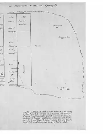 MAP OF COWLITZ FARM as cultivated in 1845 and spring of 1846. Note that 1847 and 1848 crops are also indicated. (Photostat from Cartographic Branch,. National Archives, Record Group 76, Boundary and Claims Commissions and Arbitrations. U. S. and Great Britain, Hudson's Bay and Puget's Sound Agricultural Companies, Treaty of June 15, 1846.)