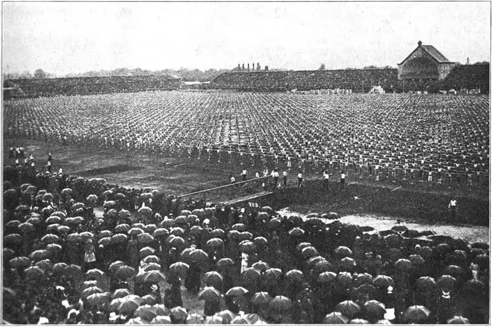 As a sight the 10,112 men drilling as one compact mass to be replaced by 10,112 women, at once presented a magnificent spectacle long to be remembered. It carries one back to the classical days of Greece when athletic development and bodily perfection were esteemed as essential qualities of a nation. The word “Sokol” freely translated means “Hawk” or “Falcon’ and is regarded by the Slavs more as symbol of strength. A possible American comparison