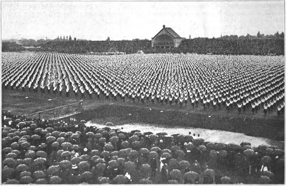 Then the first series of figures in standing position with flexible movements of arms and hands followed the musical accompaniment. The second and third series followed in rythmic steps and in whichever direction and in whatever angle one looked there was a symmetrical line of kaleidoscopic movements and figures that dazzled by their brilliancy, rapidity and splendor. Instantly it would arrest itself, the band would strike up a new theme, the trumpet ring out and another figure would follow, breathlessly watched by the vast throng with restrained attention. For three-quarters of an hour the men, whose arms, shoulders and bodies gave a vivid impression of health and vigor, continued their evolutions, then closed their ranks,