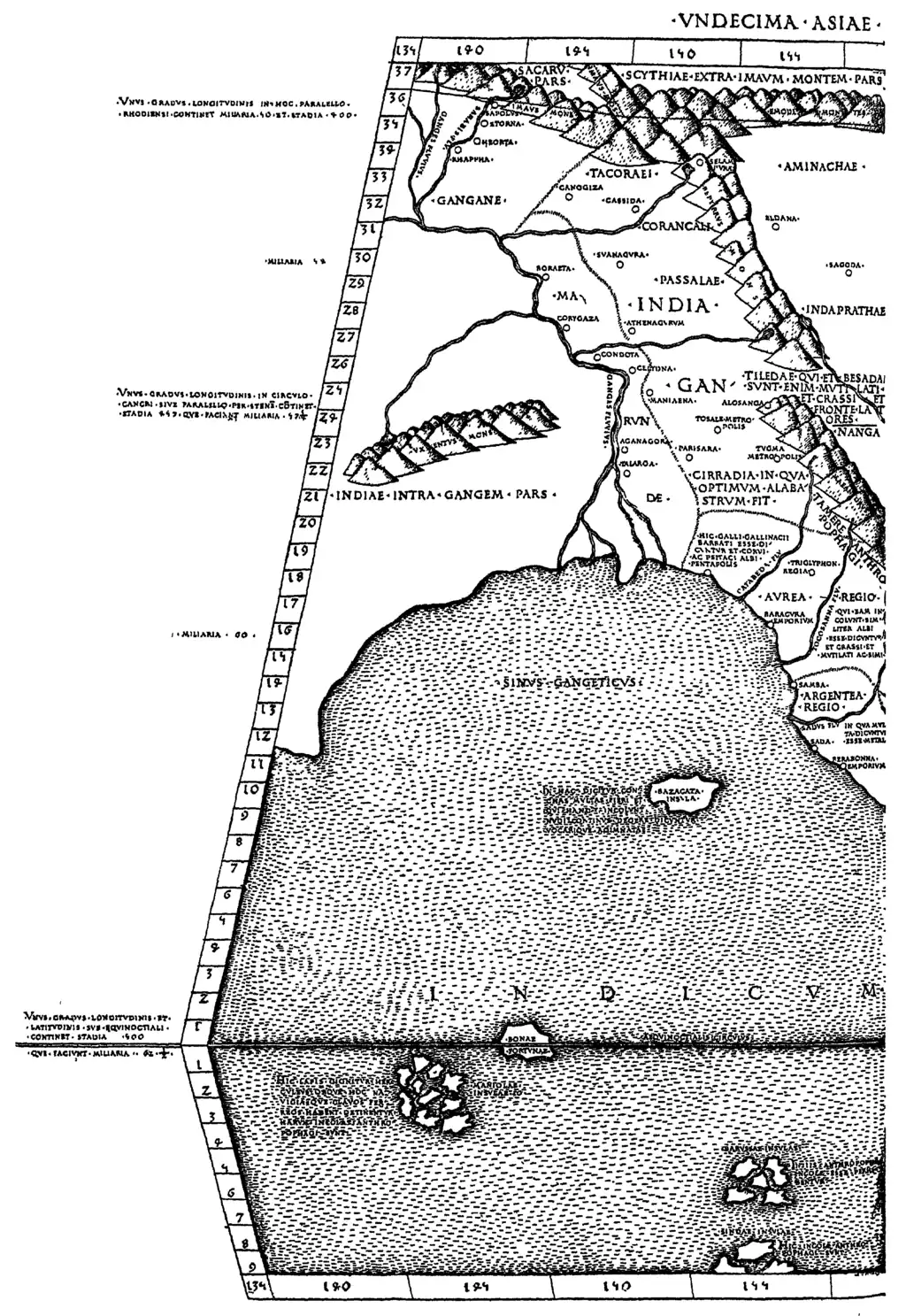 . PART OF MAP OF INDIA 'without the Ganges', from the Latin edition of Ptolemy's Geography, printed at Rome in 1490.