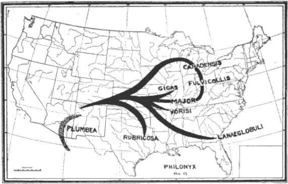 four hundred miles of Plains that are now barren of oak. Between the Rocky Mountain oak of northern Colorado and the westernmost extension of the eastern Quercus macrocarpa in northwestern Nebraska is a stretch of fully two hundred miles. In the Black Hills of the South Dakota-Wyoming boundary, this same eastern oak comes into contact with the Rocky Mountain Quercus Gambelii, but this could at most
