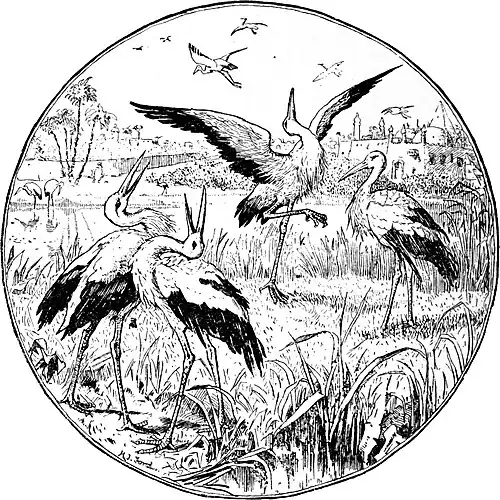 Thereupon the young stork began to move about with the most wonderful steps. The Caliph and Mansor looked on in surprise for some time; but when at last she balanced herself in a picturesque attitude on one leg, and flapped her wings gracefully up and down, they could hold out no longer; a prolonged peal burst from each of their bills, and it was some time before they could recover their composure. The Caliph was the first to collect himself. ‘That was the best joke,’ said he, ‘I’ve ever seen. It’s a pity the stupid creatures were scared away by our laughter, or no doubt they would have sung next!’