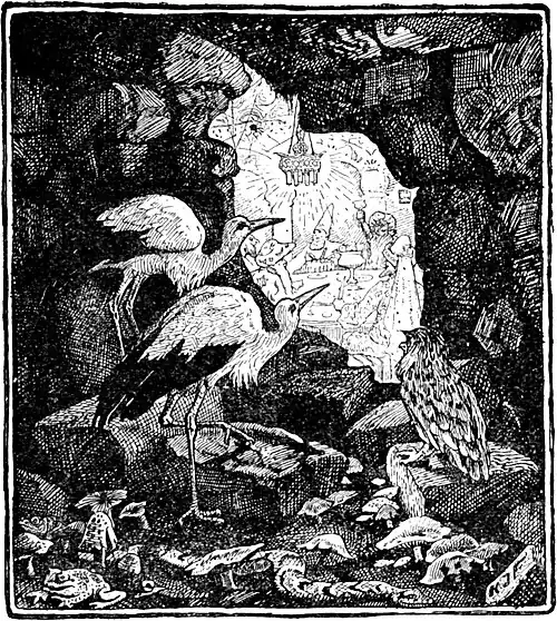 As soon as the storks heard this they were nearly beside themselves with joy. They ran at such a pace to the door of the ruined castle that the owl could scarcely keep up with them. When they reached it the Caliph turned to the owl, and said with much feeling: ‘Deliverer of my friend and myself, as a proof of my eternal gratitude, accept me as your husband.’ Then he turned