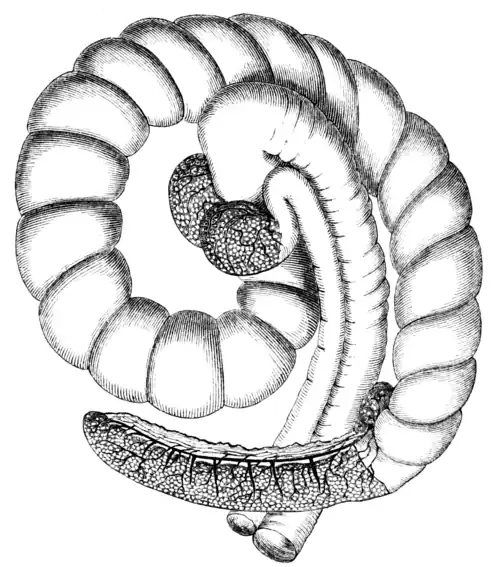Fig. 1.—Vermiform Appendix, Caecum, and parts of Small Intestine and Colon of Rabbit (Lepus cuniculus), with the Peyerian and also some of the mesenteric glands in connexion with them injected. The ileum and colon lie side by side, the former describing a siphon-shaped curve before ending in a dilatation, known as the 'sacculus rotundus,' and homologous with the aggregation of Peyerian follicles situated in man just anteriorly to the ileo-caecal valve. The sacculus rotundus occupies the centre of the figure; above and a little to the left of it another somewhat similar aggregation of Peyerian follicles is seen just beyond the ileocolic valve. The colon curves backwards externally to and concentrically with the ileum. The caecum consists of two portions: one larger in calibre, thinner in walls, and sacculated spirally; the other, the homologue of the human 'appendix vermiformis,' smaller in calibre, but with much thicker walls. It has been injected as described in the text, and the injection is seen to have passed into some mesenteric glands situated close to the junction of the two segments of the caecum, and between it and the colon.