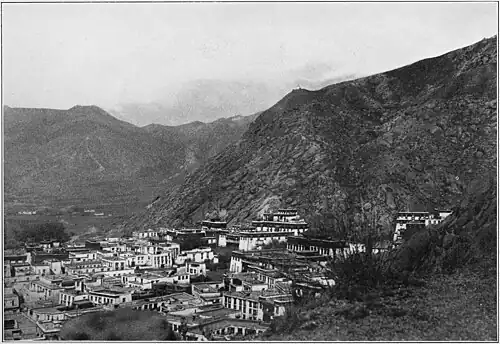 The building crowning the peak about the center of the picture is the monastery of Sera, which is famous in Tibet for its ascetics. The civilian population of Lhasa scarcely exceeds 10,000 persons, about two-thirds of them women, although the number may seem greater on account of the proximity of two large monasteries, the many transient visitors, and the gatherings of worshippers from (illegible text)