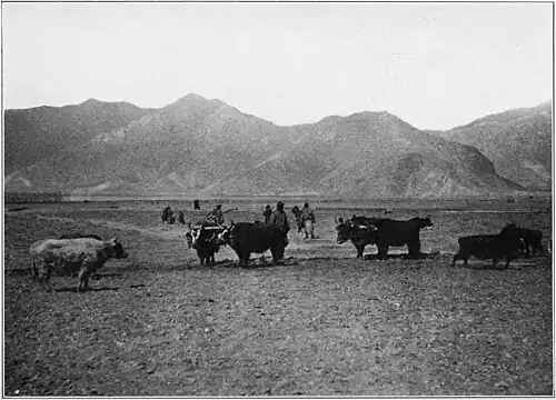 Agriculture is the chief occupation of the settled population. Barley is the standard crop, from which the popular and harmless barley-wine is made; then comes wheat, for wheat flour; beans for oil, and peas, used by the poorer class in form of flour, or crushed for horses, mules, and asses. The field work is done principally by "dzo" (a cross breed of yak and ordinary cattle), yaks, and asses.