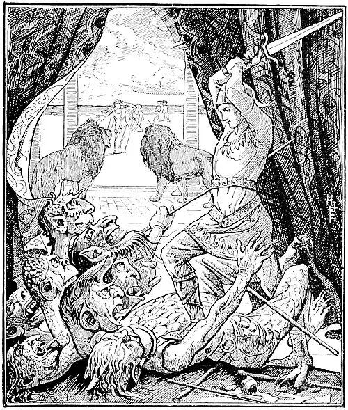On the third night a Troll came who had nine heads and nine rods, and he struck the lad and flogged him so long, that at last he