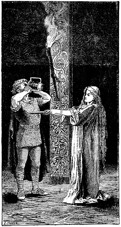 day Gudrun’s witch mother put poppy and forgetful drugs in a magical cup, and bade Sigurd drink to her health, and he drank, and instantly he forgot poor Brynhild and he loved Gudrun, and they were married with great rejoicings.