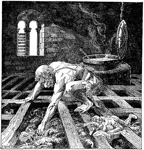 him calling for his pie. When she set it down before him he swore it smelled like swine’s flesh, but knowing where to find the finger, she immediately turned it up, which fairly convinced him of the contrary. The pie only served to sharpen his appetite, and I heard him sharpening his knife and saying he must have a collop or two, for he was not near satisfied. But what was my terror when I heard