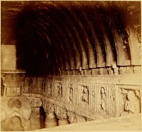 VIEW taken from the upper gallery, showing the construction of the roof, which still retains the wooden forms of ribs with a ridge piece, though being cut in the rock they are probably stouter and thicker than they were when really executed in timber. The upper part of the daghopa is also seen, with its three umbrellas, but these have departed still further from their wooden prototypes, and are fast approaching those forms which gave rise to the three, six, and nine-storied towers of the Jains, and which are still built at the present day in China. The connexion between the porcelain tower at Nankin, and a hemispherical dome surmounted by a wooden umbrella, is certainly not at first sight apparent; but there are few things more clear than that the one is the direct lineal descendant of the other, and every step of the change can be pointed out.