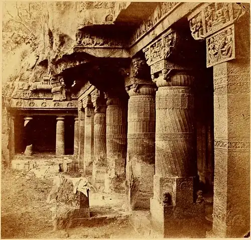 The two beyond these are comparatively plain octagons, with only slight ornamental markings, and the half columns are square, with only a circular necking below the square block of the capital. All these pillars, however, have bracket capitals of similar design, though the sculpture in each is varied. The whole effect is that of a well considered and carefully elaborated design, though, perhaps, hardly so appropriate to rock architecture as the design of No. 4, and some of the simpler Caves of the series.