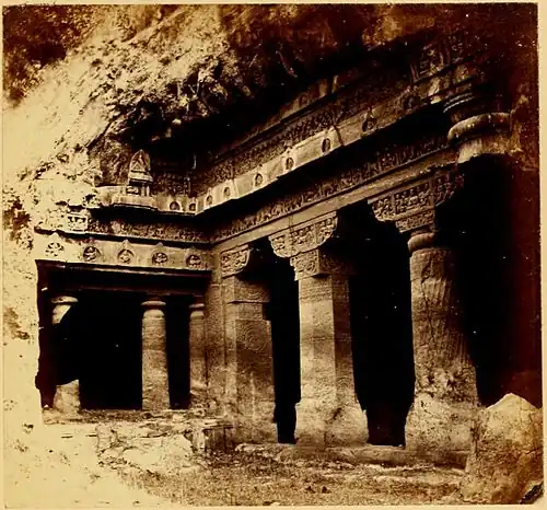 IT is not easy to make out the design of the two advanced columns in the centre. From what remains we can see that they had not bracket capitals, but were similar to those of the Cave last described (No. 2), but the double frieze of sculpture as carried round them as along the whole façade, binding it together as a whole.