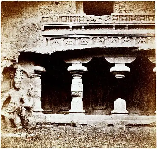 THE pit in which the Temple stands measures 150 ft. in width by 270 in length, and is surrounded on all sides by a cloister of which one bay is illustrated in the annexed view. Like everything else in the Kylas, it has the defect of being a literal copy from a structural form without any adaptation to its position. The consequence is that the pillars look painfully light or slender when considered as supporting the 80 or 100 ft. of plain rock which towers over them.