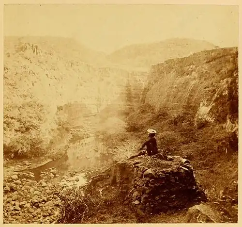 After leaping over the two artificial obstructions shewn in the last view, the river descends by numerous small falls through the first stratum in a course of about two miles long. It then reaches the edge of the lower platform, over which it falls by seven short leaps, in a narrow space just to the right of the rocks shown in the view, which close the upper end of the lower ravine.